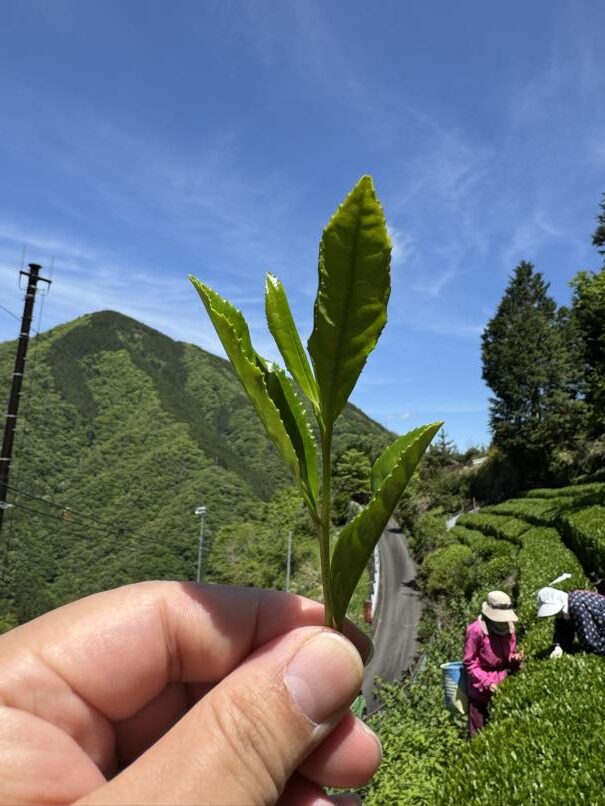 茶摘みの基本である「一芯三葉」(いっしんさんよう、芯芽と3枚の茶葉)を教えていただきました。